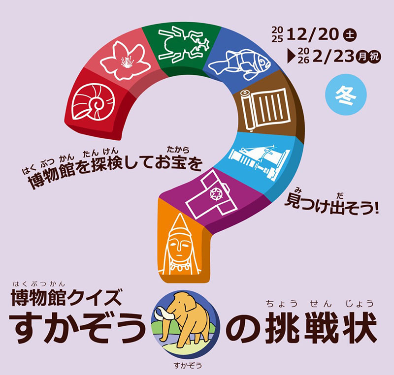 横須賀市自然・人文博物館様_スライド画像_特別展横須賀市自然・人文博物館様_スライド画像_ナウマンゾウ横須賀市自然・人文博物館様_スライド画像_はにわ横須賀市自然・人文博物館様_スライド画像_天神島 インフォメーション Information 本日は開館日です。開館時間:9:00 ~ 17:00入場無料-Admission Free-アクセス-Access-団体見学-Group Visits-休館日12月1日8日15日22日29日30日31日1月1日2日3日5日13日19日26日開館園カレンダー 本日のイベントイベント本日のイベントはありません。展示トピックス展示「馬とウマにちなんだ自然のなかまたち」トピックス展示「博物館実習生たちの昭和展」トピックス展示「昭和戦前・戦中期の雑誌」特別展示「横須賀の歩んだ昭和」 新着情報 What’s New すべて おしらせ 学芸 Topics おしらせ2025.12.06【開催中】トピックス展示「馬とウマにちなんだ自然のなかまたち」学芸 Topics2025.12.02虎は千里往って千里還ると申しまして…【学芸員自然と歴史のたより】学芸 Topics2025.11.27横須賀市博物館報72号を公開しましたおしらせ2025.11.11「横須賀市自然・人文博物館リニューアル基本計画」を策定しました学芸 Topics2025.11.01敗戦後、浦賀が迎えた帰還者たち【学芸員自然と歴史のたより】おしらせ2025.12.06【開催中】トピックス展示「馬とウマにちなんだ自然のなかまたち」おしらせ2025.11.11「横須賀市自然・人文博物館リニューアル基本計画」を策定しましたおしらせ2025.10.29【11/1から開催】トピックス展示「トイレについて知る・考える」おしらせ2025.09.20【9月20日(土)から】博物館クイズ「すかぞうの挑戦状」を開催します!おしらせ2025.08.29【8/30から開催】トピックス展示「平和中央公園の秋の植物」学芸 Topics2025.12.02虎は千里往って千里還ると申しまして…【学芸員自然と歴史のたより】学芸 Topics2025.11.27横須賀市博物館報72号を公開しました学芸 Topics2025.11.01敗戦後、浦賀が迎えた帰還者たち【学芸員自然と歴史のたより】学芸 Topics2025.10.13学芸員の柴田がアンモナイトに関する論文を発表しました学芸 Topics2025.10.03再び開花!天神島のアオノリュウゼツラン【学芸員自然と歴史のたより】新着情報一覧 おしらせ一覧 学芸トピックス一覧 展示情報 Exhibitions 特別展示特別展示「横須賀の歩んだ昭和」7月19日(土) ~ 12月28日(日)トピックス展示トピックス展示「昭和戦前・戦中期の雑誌」7月19日(土) ~ 12月28日(日)トピックス展示トピックス展示「博物館実習生たちの昭和展」11月29日(土) ~ 12月28日(日)トピックス展示トピックス展示「馬とウマにちなんだ自然のなかまたち」12月6日(土) ~ 2月1日(日)企画展示令和7年度 かながわの遺跡展「あつまれ!!かながわのはにわ」2月5日(木) ~ 3月8日(日)展示情報一覧 常設展示 Permanent Exhibition 自然館 2F 人文館 2F 自然館 1F 人文館 1F イベント情報 Events 申込不要。参加費無料。問題用紙は本館2階受付で配布します。すかぞうの挑戦状<冬>12月20日(土) ~ 2月23日(月)ワークショップ自然素材でミニクラフト(2)12月21日(日)展示解説スチームハンマー蒸気模型の実演(12月)12月28日(日)天神島ガイドツアー【地球科学担当学芸員】(12月)12月28日(日)ワークショップ自然素材でミニクラフト(3)1月11日(日)展示解説自然館ミュージアムトーク(3)1月11日(日)自然観察会つくって学ぶ!しだ・こけテラリウム1月18日(日)展示解説スチームハンマー蒸気模型の実演(1月)1月25日(日)研究発表みんなの理科フェスティバル1月31日(土) ~ 2月1日(日)博物館教室横須賀ジオツアー2月7日(土)イベント情報一覧 付属施設 Satellite Facilities 馬堀自然教育園 天神島臨海自然教育園 ヴェルニー記念館 利用案内 User’s Guide 基本情報 アクセス 団体見学 研究紹介・資料データベース・刊行物 Research / Collection / Publications 研究紹介 資料データベース 刊行物 SNS・関連サイト SNS / Links Tweets by ycm_yokosuka Instagram 公式 Instagram YouTube 公式 YouTube