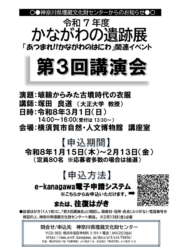 開催日: 3月1日(日) 時間 : 14:00~16:00 内容 : 令和7年度 かながわの遺跡展「あつまれ‼かながわのはにわ」関連イベントの第3回講演会を開催します。
