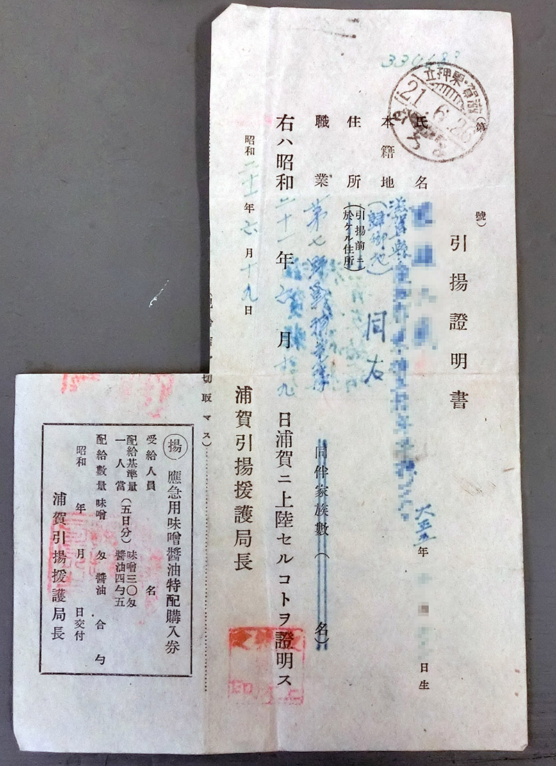 【図4】海外から浦賀へ引き揚げてきたことを証明する書類(昭和21年(1946)6月19日付、個人所蔵)