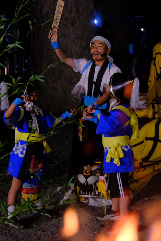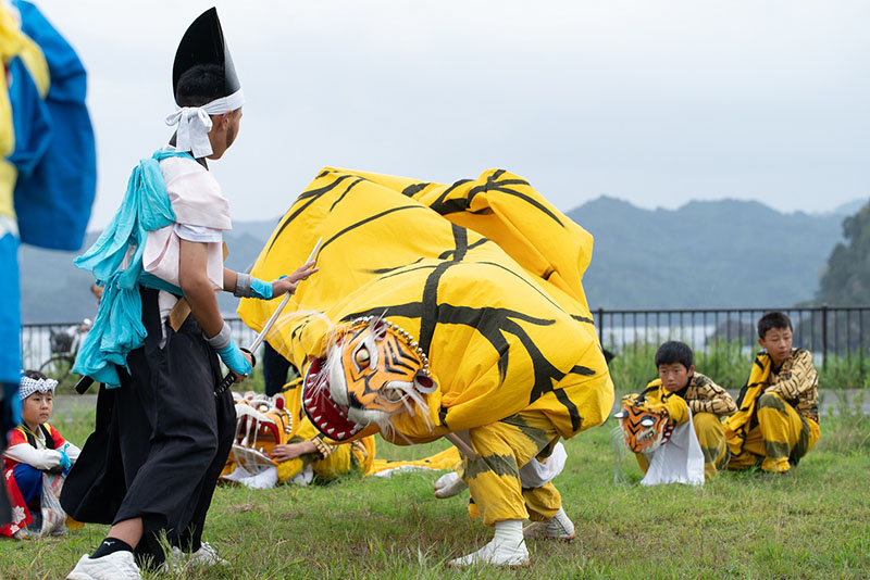 遠くに出掛けても必ず戻るということで、虎舞は漁師の海上安全を願って踊られることが多い民俗芸能です。虎舞とは、岩手県の釜石市や大槌町を中心に三陸沿岸各地で見られ、虎を模した頭に黄色と黒のしま模様の幕をつけて2人で1匹の虎として舞い踊るものです。もちろん、各地域各団体によって虎舞も様々です。舞だけに特化した演目を披露するものもあれば、それに演劇の要素が加わっているものもあります。演劇の要素とは、近松門左衛門原作の人形浄瑠璃・歌舞伎『国性爺合戦(こくせんやかっせん)』の「千里々竹」という場面をもとにしたもので、和唐内(わとうない)という人物が虎を退治する場面です。